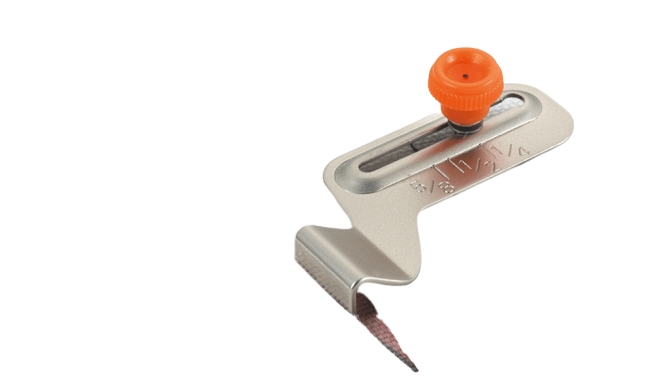 Screws on to needle plate for accurate seam measurement while sewing. Engraved measurement markings. Screws on in front of all Brother presser feet for expanded visibility.