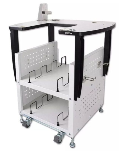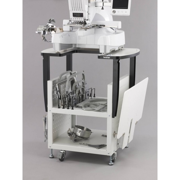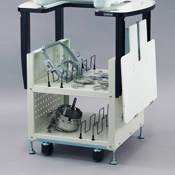 This Brother metal stand,now has a wider table area with rounded edges and extra storage for all your large frames, like the Cap Frame and Cylinder Frame! Improved legs on the stand allow you to adjust the legs in 2 inch increments.