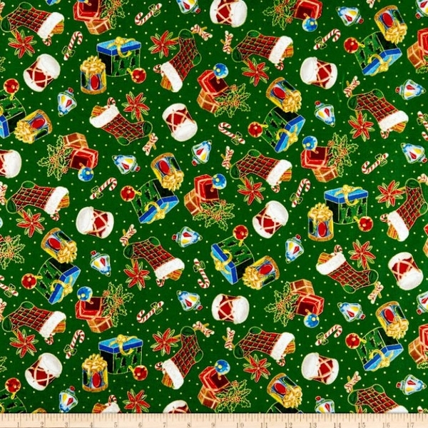 Quilting Treasures Christmas Eve Presents & Stockings on Green Fabric.