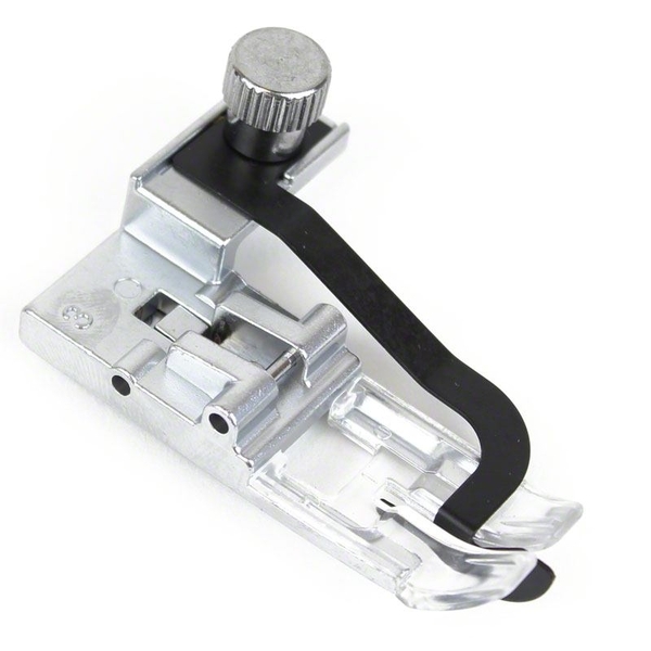 The Center Guide Foot for the CoverPro Series allows you to line up the center of a two or three needle stitch with an existing seam for straighter, more accurate stitches. It is excellent for sportswear and gives extra strength to seams that are exposed to a lot of strain. Use it to tack down already sewn seams or to finish with a decorative effect. Place the center guide in an existing seam, lower the foot, and follow the existing seam as you sew.