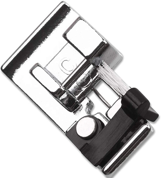 Use with an overcasting stitch to allow thread to wrap around the edge of the fabric to prevent unraveling. The foot guides the fabric and keeps your edges flat by compensating for the lack of friction when the needle makes the right-most stitch.