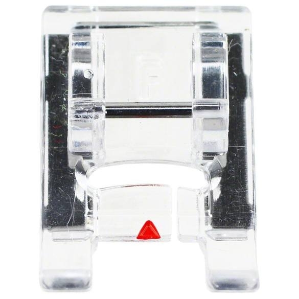 The bottom of the foot is beveled for smooth delivery of thread when sewing decorative or satin stitches. Foot is made of clear plastic making it easier to view stitching.