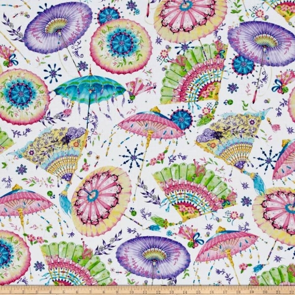 Fanfare Multi Fans & Parasols on White Fabric.