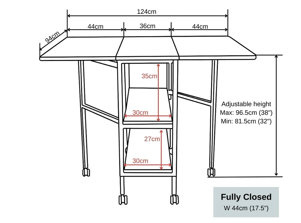 Able to fold down much smaller than its bigger sister, the Hi-Lo MK-2. At a little over 1ft wide when fully closed down it can be tucked away in most rooms