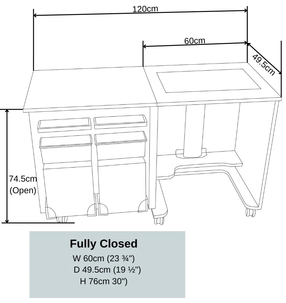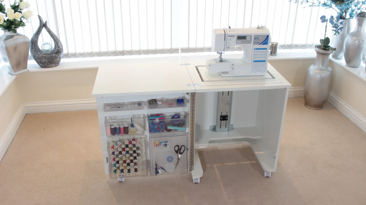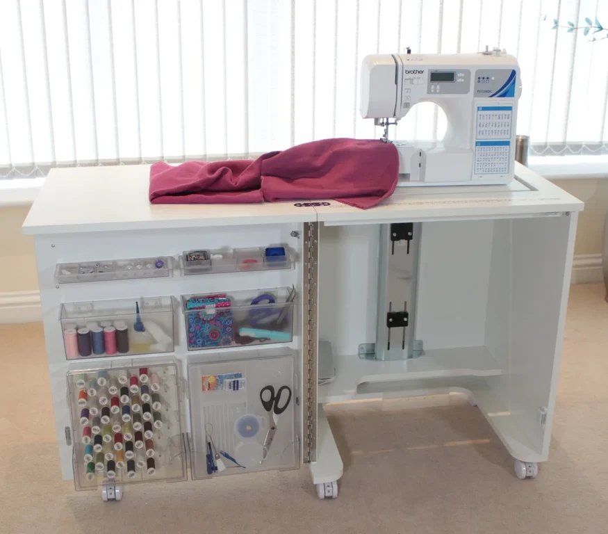 The Cub Plus, a sewing cabinet with a classic design, is perfect for smaller sewing areas. It includes a 3-step Air-Lifter, removable transparent door storage for accessories, and a designated space for your sewing machine. Experience the benefits of a full-size sewing cabinet in an elegant and space-saving design.