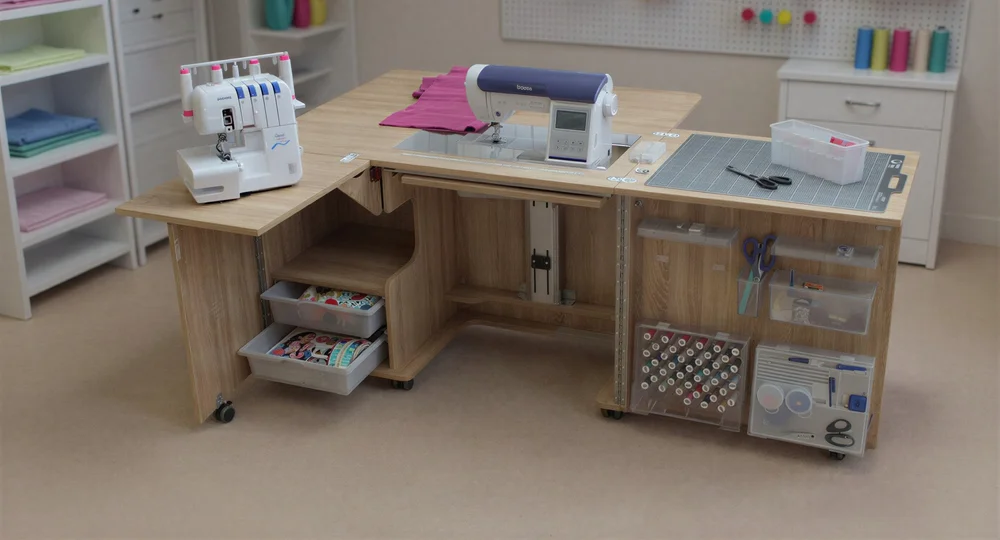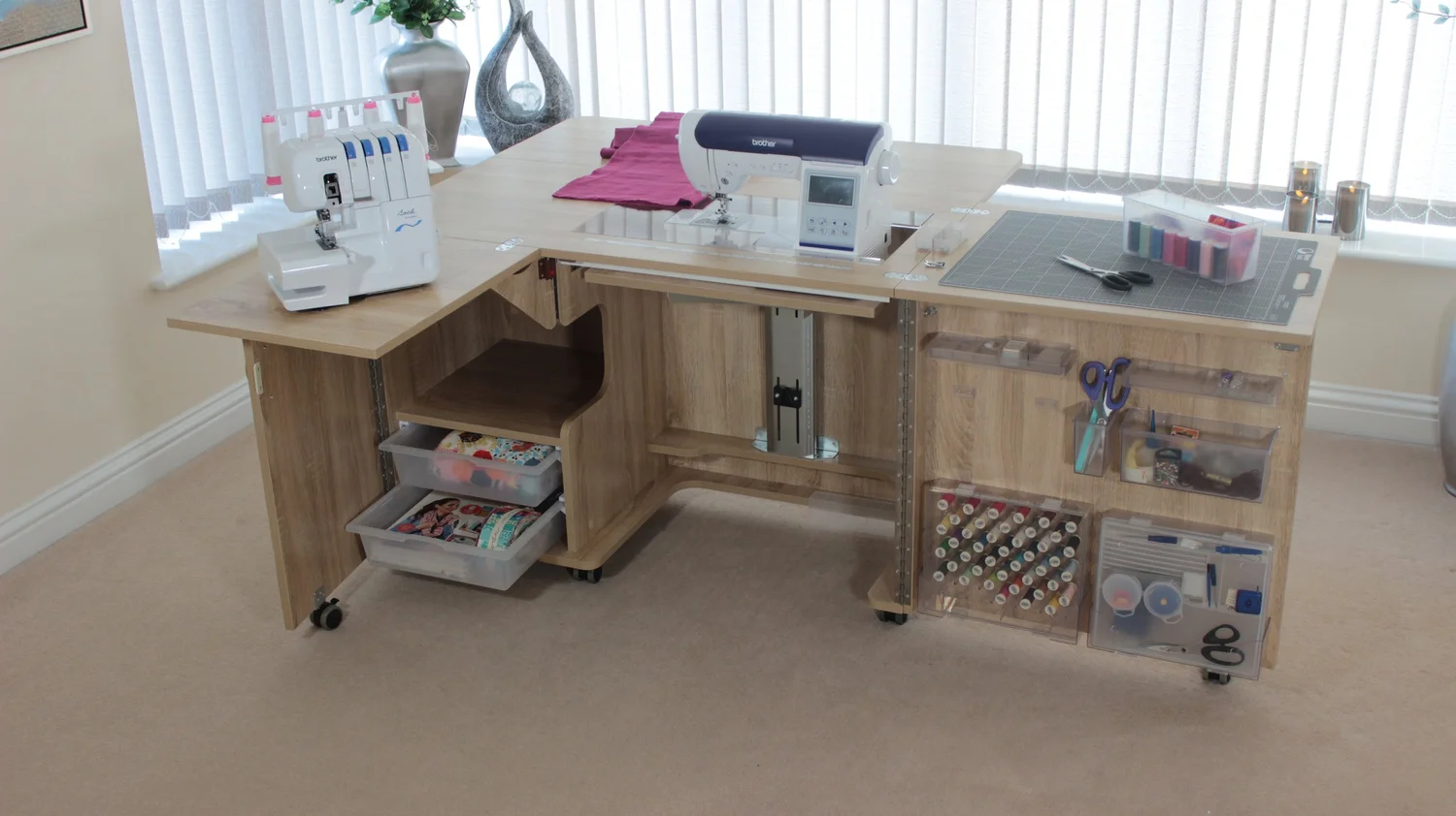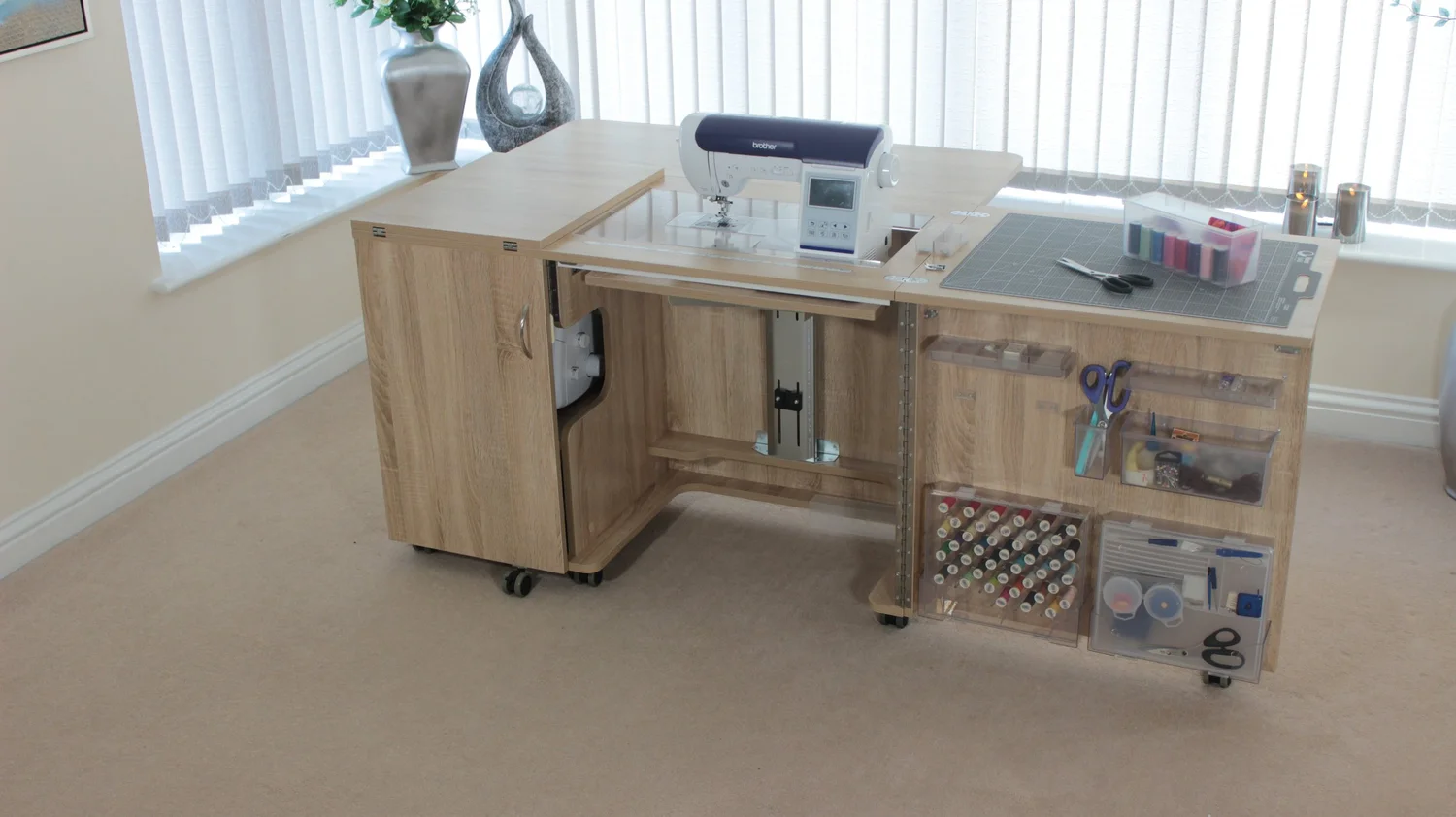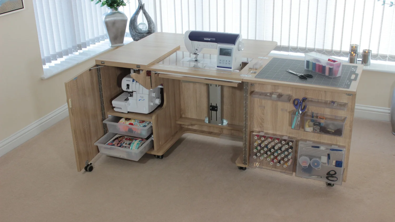 Stores both a sewing machine and an overlocker, or maybe a second smaller portable machine if you prefer.