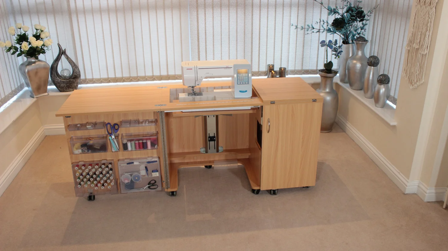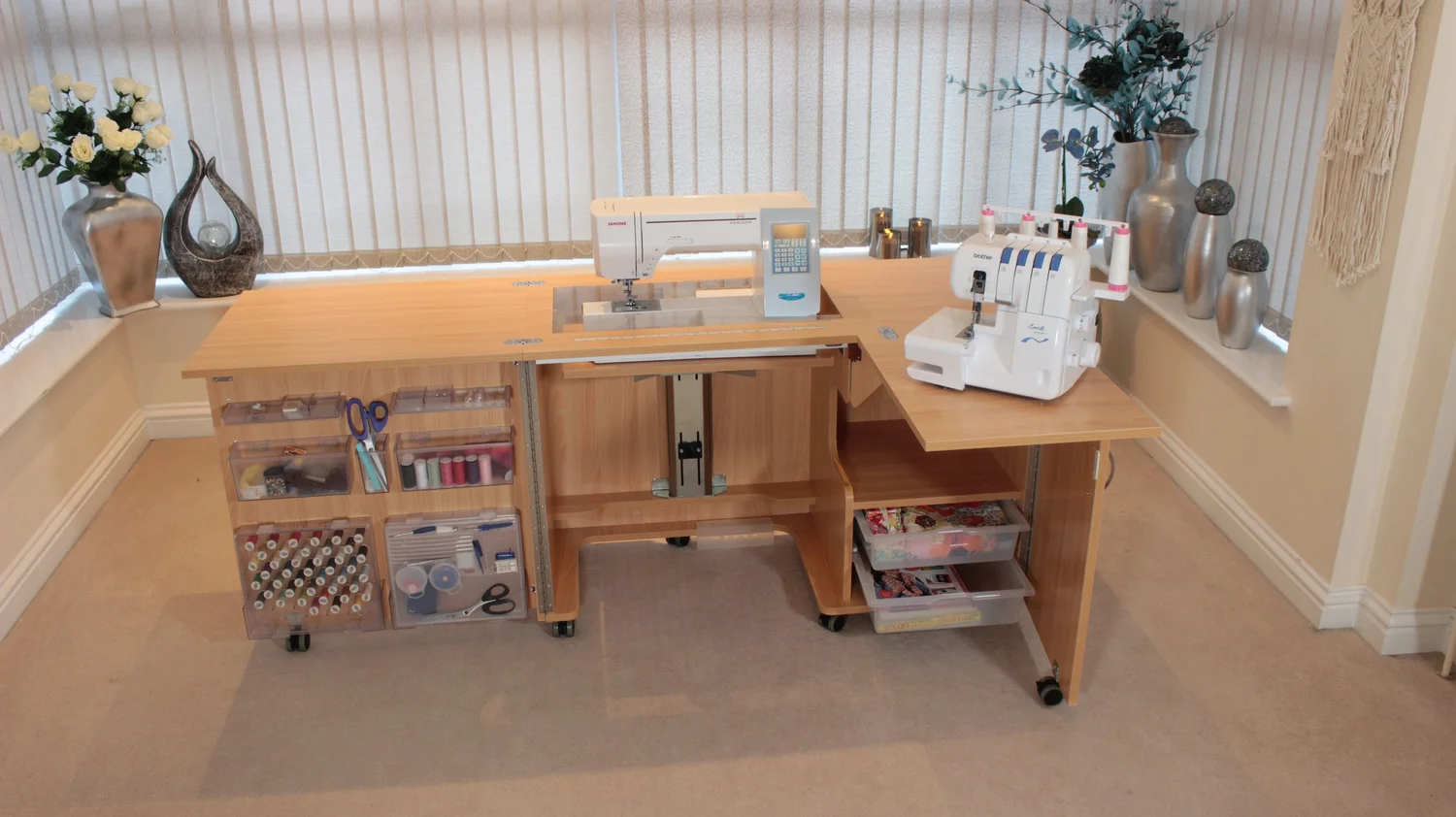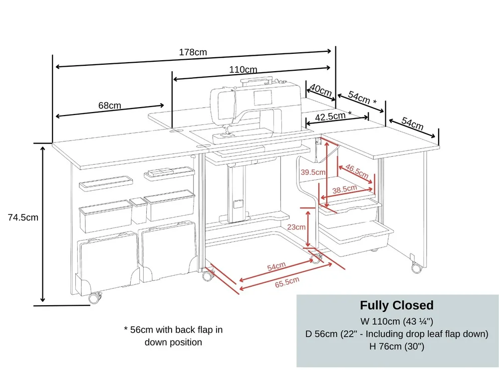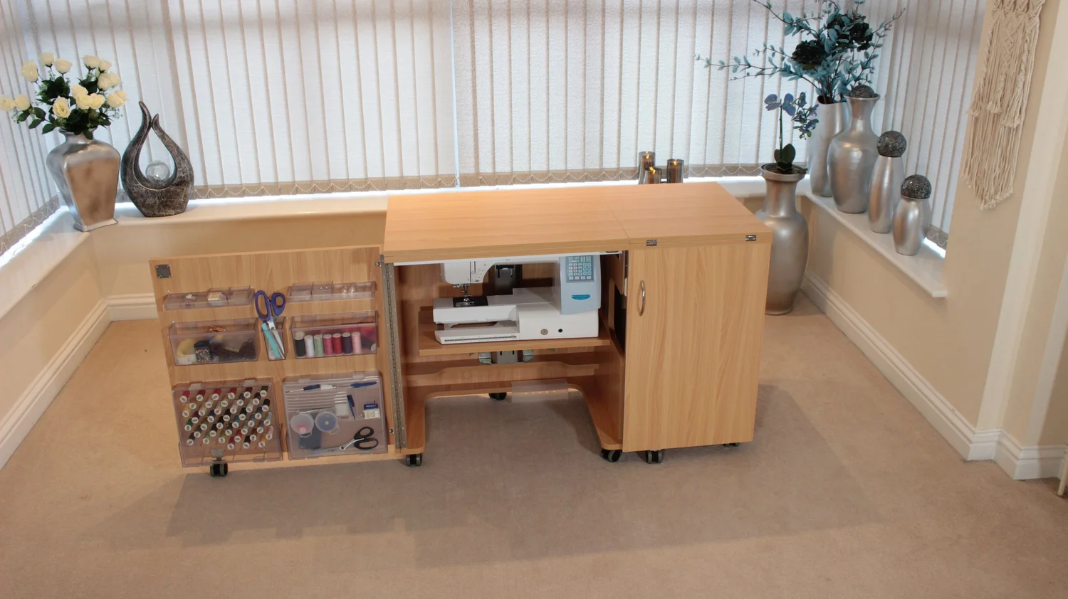 Stores both a sewing machine and an overlocker, or maybe a second smaller portable machine if you prefer.