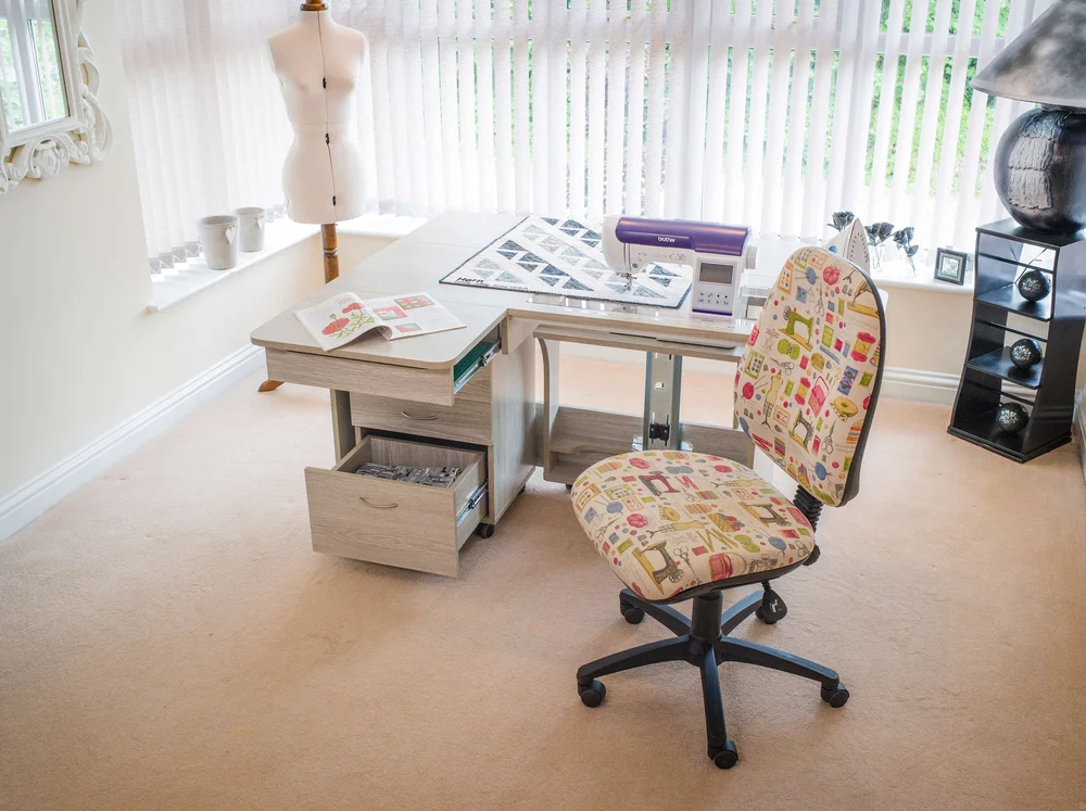 Fitted with our Maxi-lifter opening (type 1942) which is capable of taking virtually all domestic sewing machines on the market old or new! Please note, although the Quilter’s Delight MK-2 is designed using our largest opening, and will fit virtually all of the larger machines on the market, it doesn’t offer the best seating position for them. If you own a machine such as the Bernina 7 or 8 Series; Husqvarna Epics; Janome Horizons or Brother V Series, for the best seating experience we would recommend looking at our models above the Quilter’s Delight (i.e. the Super Q and Super Q MK-2).