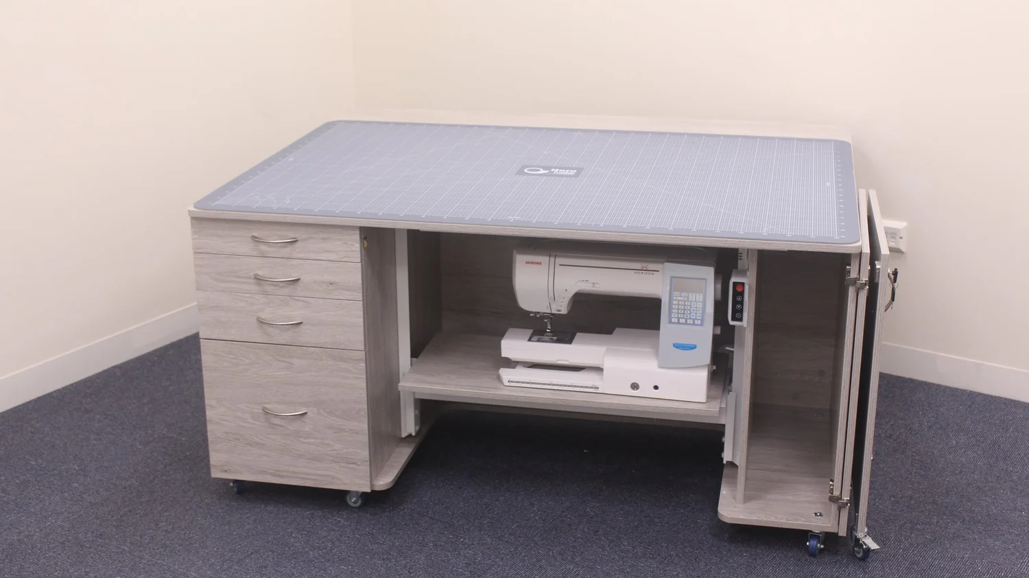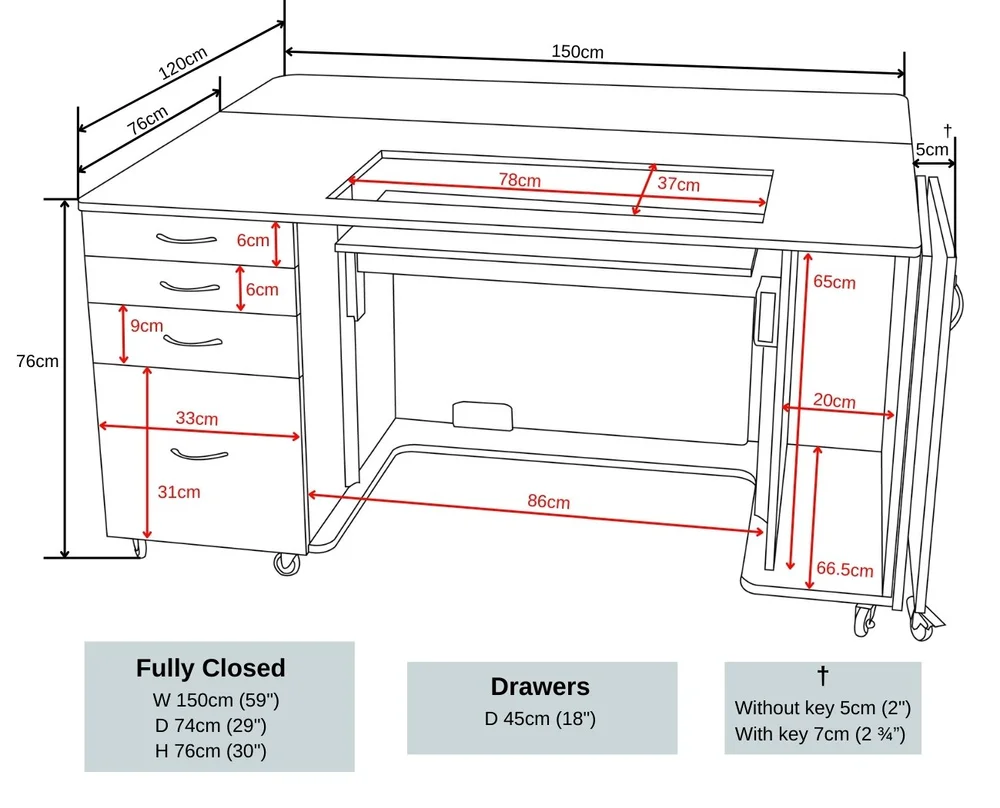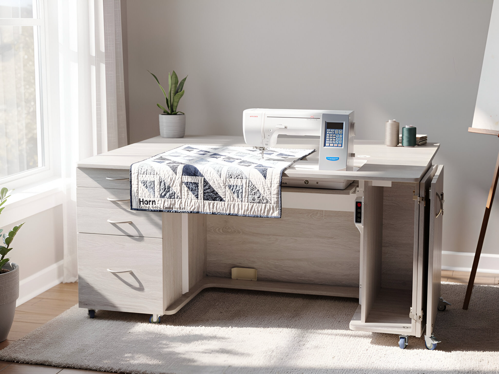 This unit is a fantastic all-rounder in our Electric range. It combines our electric lift with a huge amount of workspace and ample storage for your accessories, fabric, embroidery hoop and embroidery arms. Available in three different finishes allowing you to match it to your work space. This is the perfect workstation for the avid sewer, quilter and patchworker alike.