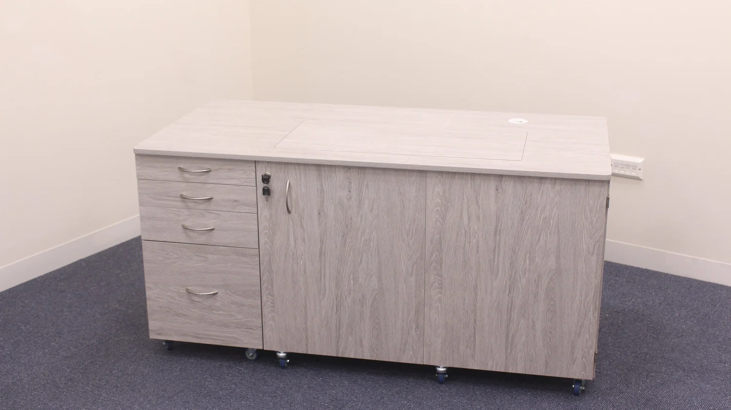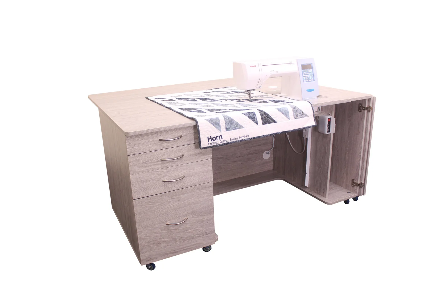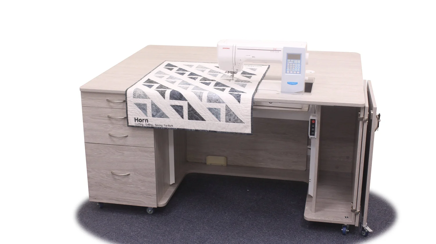 This unit is a fantastic all-rounder in our Electric range. It combines our electric lift with a huge amount of workspace and ample storage for your accessories, fabric, embroidery hoop and embroidery arms. Available in three different finishes allowing you to match it to your work space. This is the perfect workstation for the avid sewer, quilter and patchworker alike.