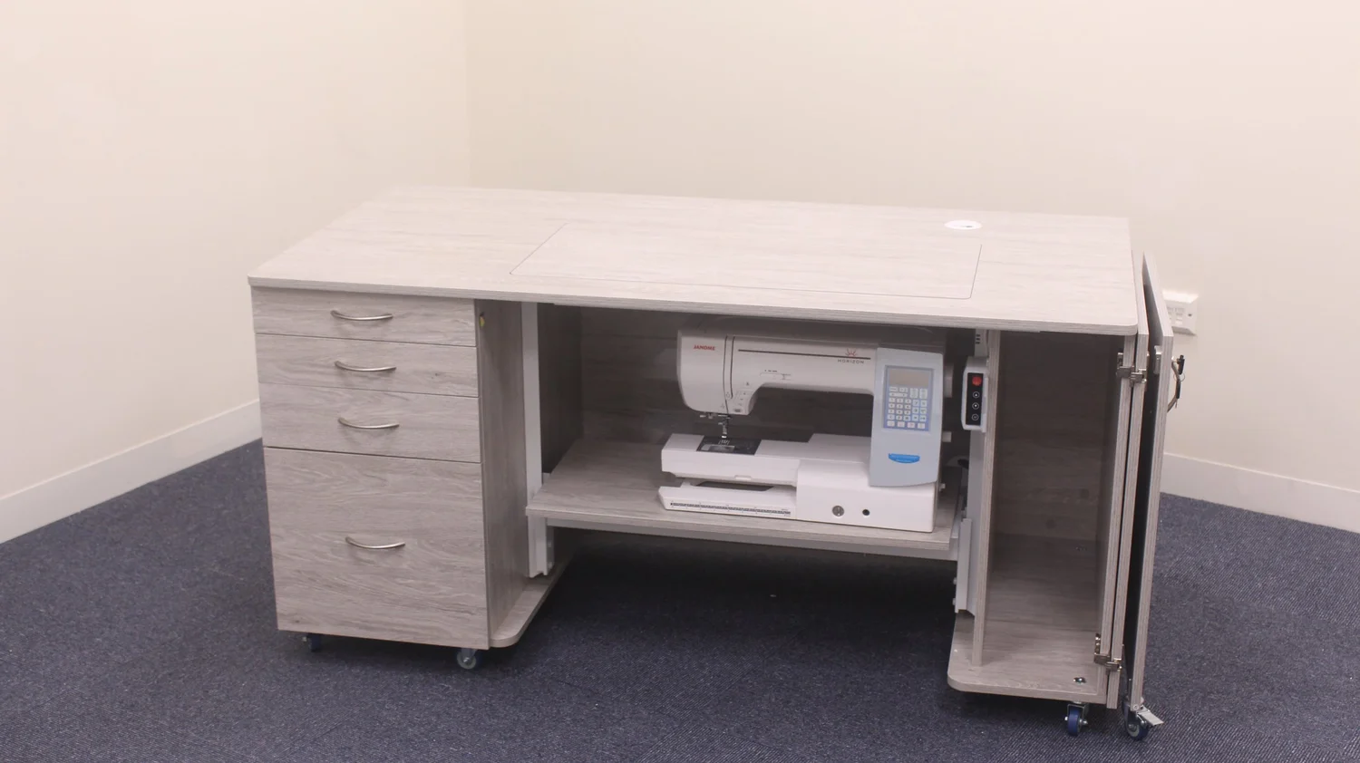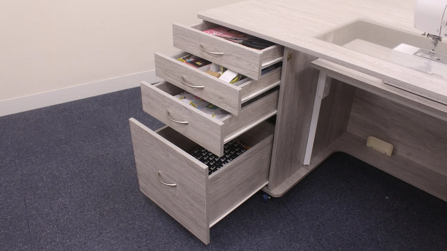 Deep integrated drawers can store accessories, notions and fabric.