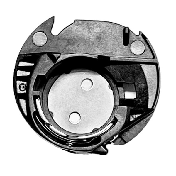 This bobbin case holds the threaded bobbin safely in the lower part of the sewing machine.