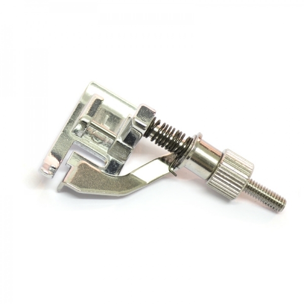 The foot has a metal guide in the centre and three lines struck on the underside. During blind hemming, the fold of the fabric snugs against the guide in the foot for accuracy whilst the lines underneath help to prevent unnecessary slipping.