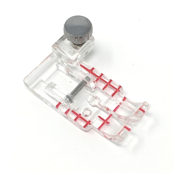 We all know that at times the guide on the 1/4″ seam foot can be “in the way” and often wish that we could remove it when needed. Well that time has come with the introduction of this set. When you want the benefit of guides for piercing or ditch quilting, these can know be attached and removed as needed to suit the tak at hand. This clear view foot allows you to see through the fabric whilst the red guide lines on it help you to achieve accurate piercing without any obstruction. There is also the added bonus of an oval shaped needle hole which allows needle adjustment for scant 1/4″ piercing with maximum adjustment of 1mm. Markings on the foot indicate ” and 1/4″ from centre needle drop position with handy cornering markings for both measurements.