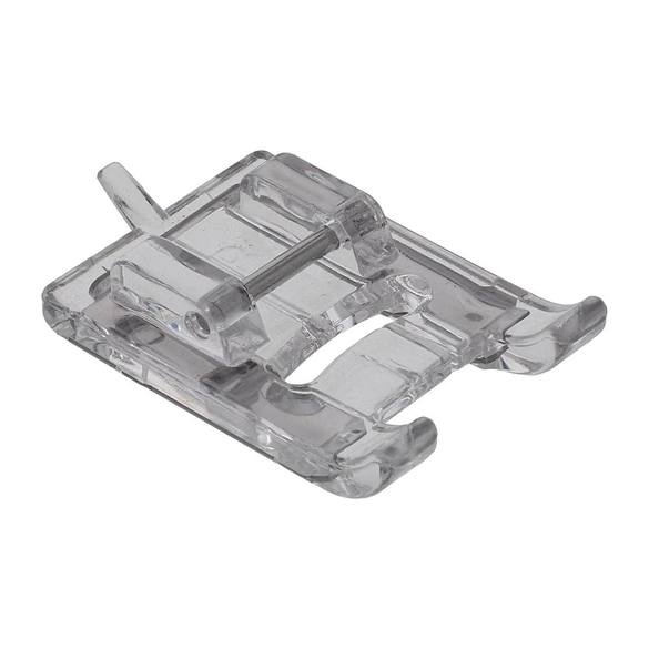 This foot makes it possible to sew buttonholes longer than 2.5cm. It is also effective on tight areas such as cuffs where more freedom of movement is required than available with a sliding-type buttonhole foot.