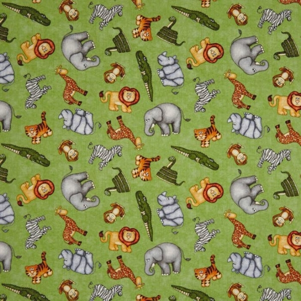 Quilting Treasures Jungle Buddies Tossed Animals on Green Fabric.