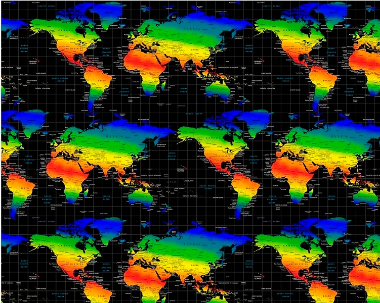 Timeless Treasures Multicolour World Map on Black Fabric Panel.