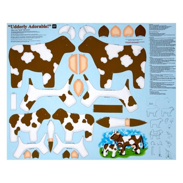 Dimensions: Width 43/44 inches x 36" Panel. Baby Cow: 10" W x 8" H. Mom Cow: 15"W x 13" H Composition: 100% Cotton. Colours: Brown / White. Other colours include shades of brown, white, blue and peach. Care Instructions: Machine wash cold. Normal cycle with like colours. Use non-chlorine bleach when needed. Tumble dry medium. Remove promtly. Use warm iron. Fabrics sold per panel.