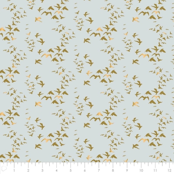 Camelot Fabrics Up, Up & Away Metallic Gold Birds on Blue Fabric.