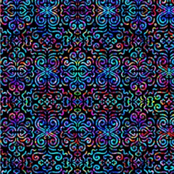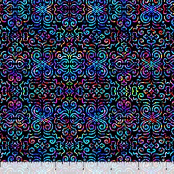 Quilting Treasures Zanzibar Set Geo Multi on Black Fabric.
